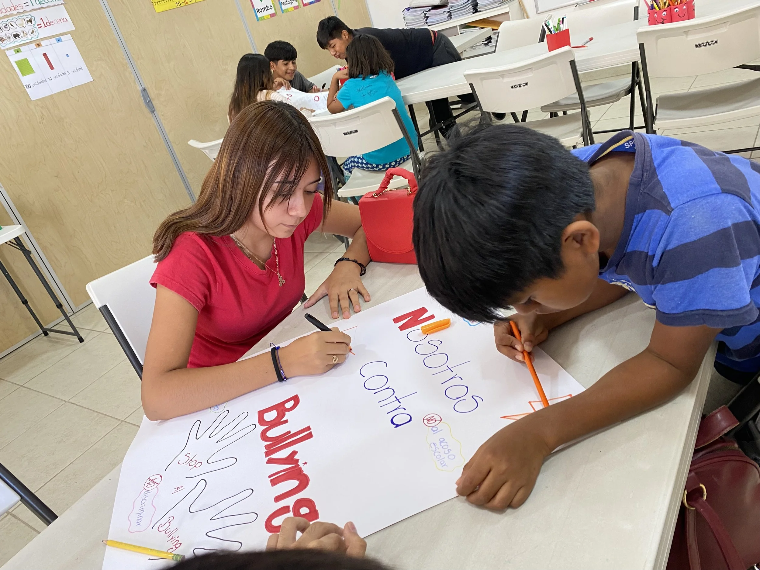 On the second day, the workshop shifted focus to prevention strategies, emphasizing the importance of resilience and friendship. The students learned that fostering a supportive and friendly environment can significantly reduce the likelihood of bullying. They were divided into teams to create anti-bullying campaigns. The older group designed a poster featuring a catchy slogan that would be displayed around Casa Esperanza, while the younger group crafted bracelets with their campaign's message to distribute among classmates and staff.